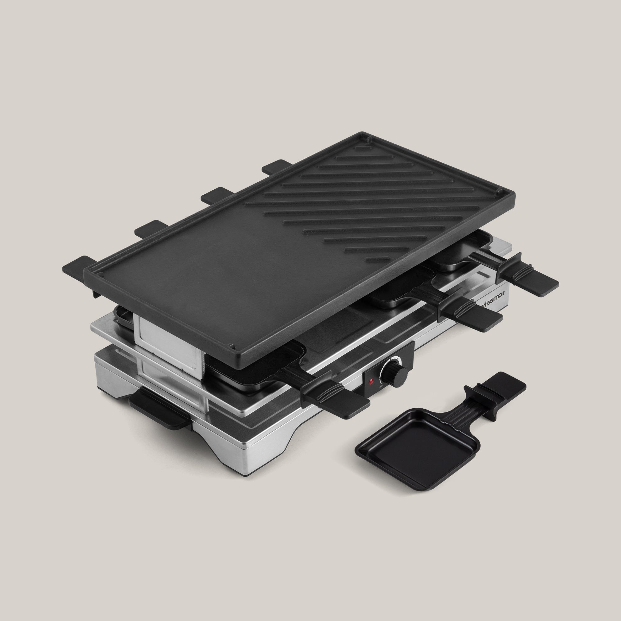- Set includes: 1.8-meter power cord length, 8 raclette dishes, 8 heat-resistant spatulas