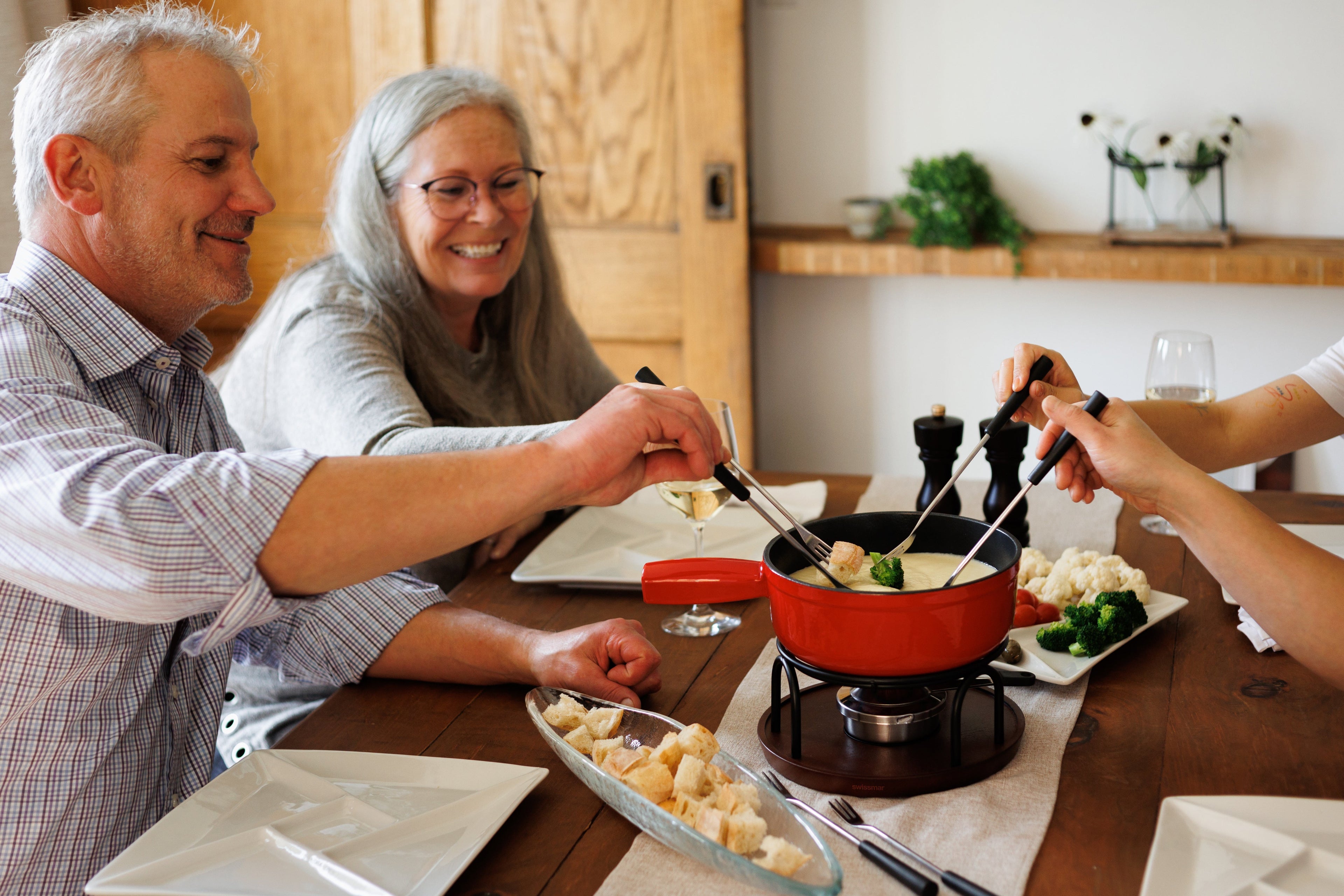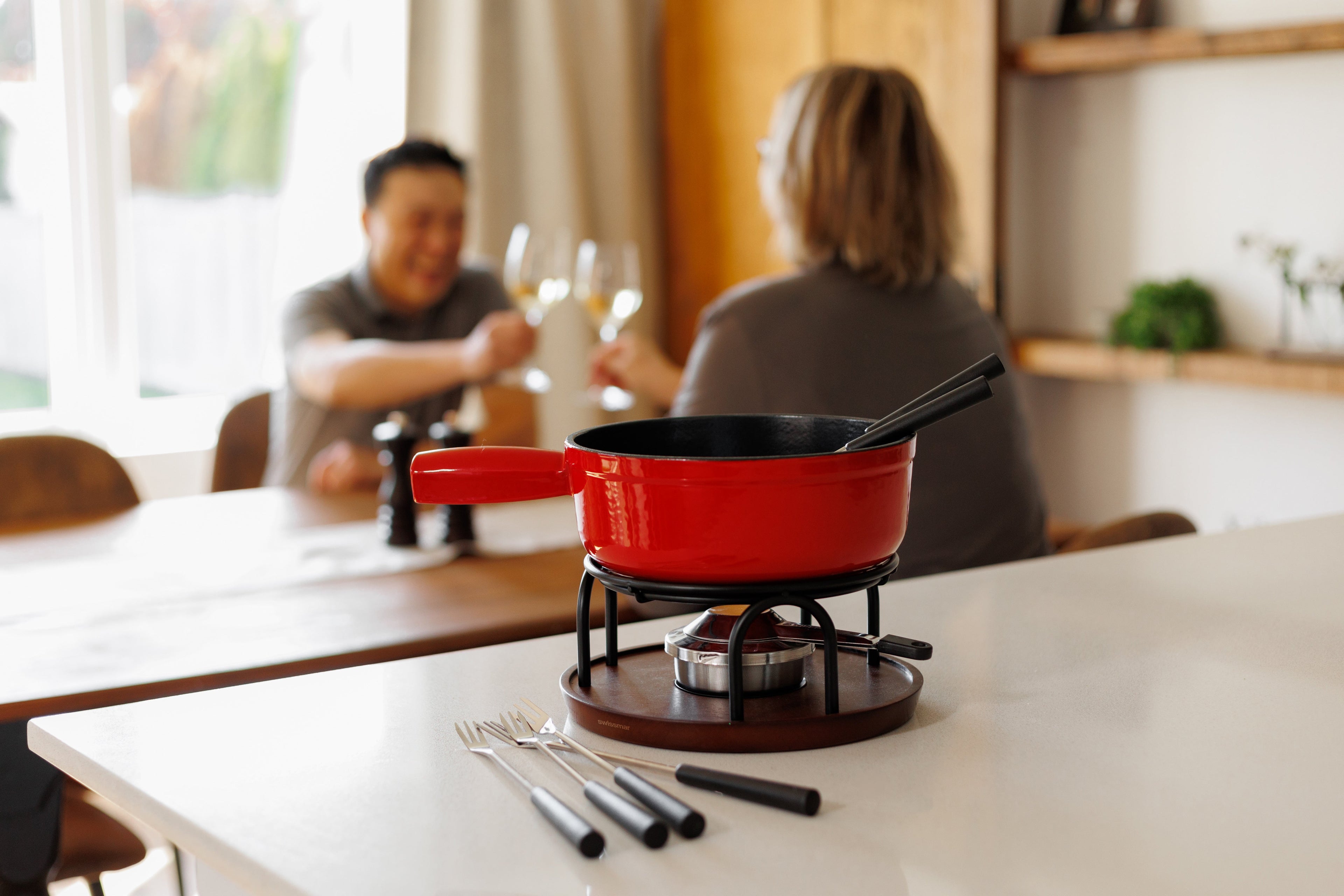 Cast iron construction ensures even heat distribution and excellent heat retention, delivering smooth, creamy cheese fondue every time.