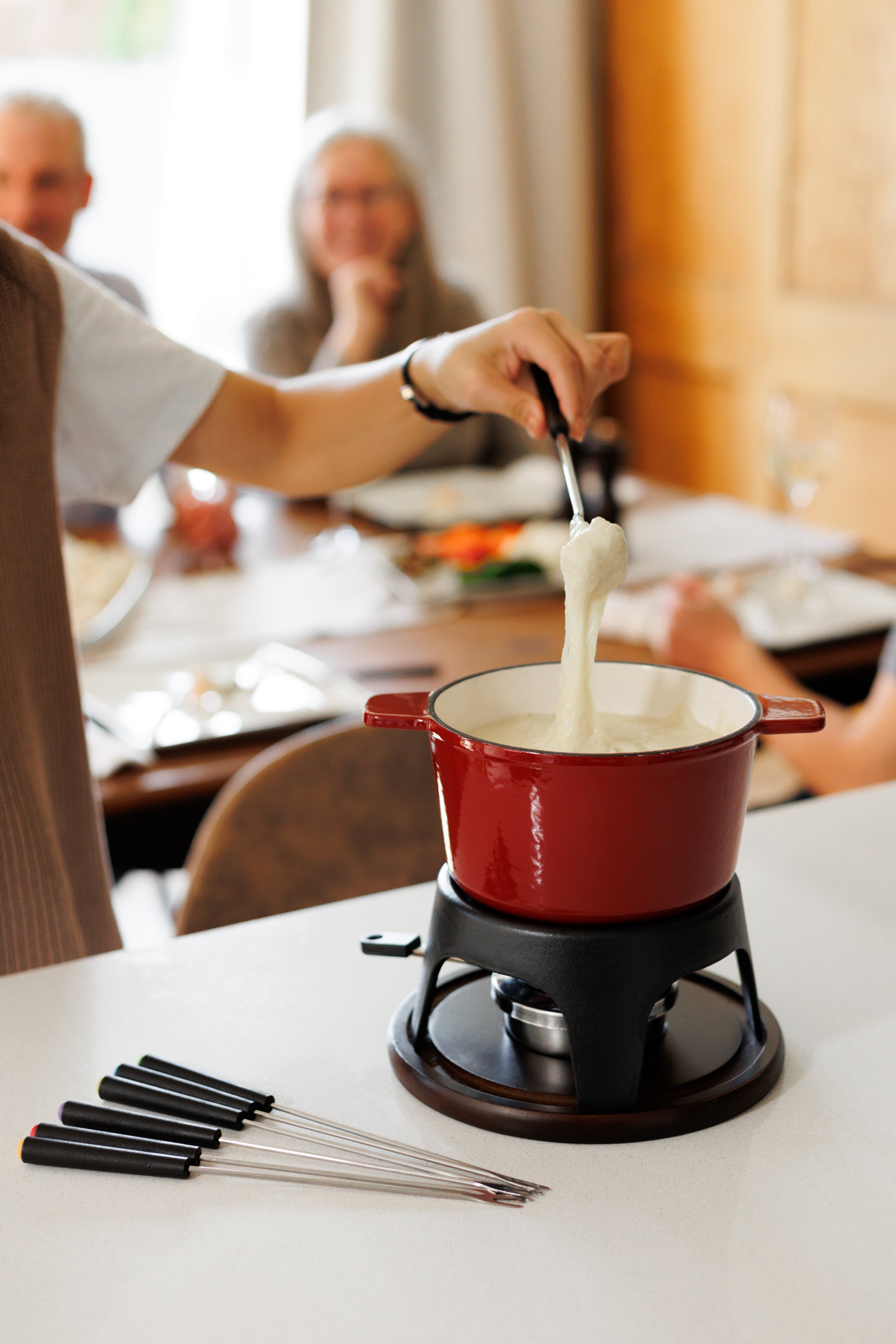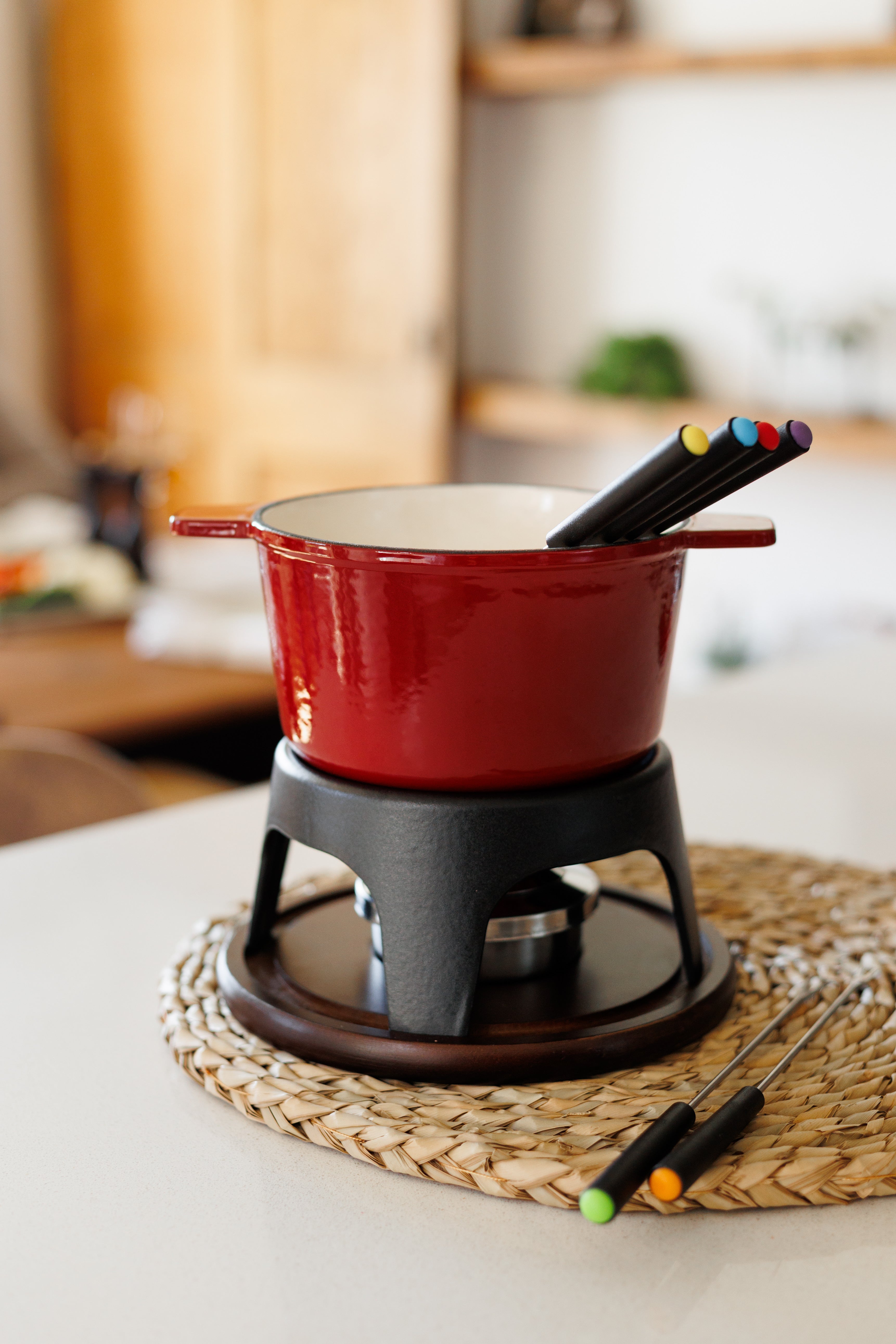 The Sierra fondue set is designed to deliver an authentic and enjoyable fondue experience. The 1.6 QT (1.51L) enameled cast iron pot ensures even heating and excellent heat retention, ideal for maintaining the perfect temperature for cheese, chocolate, or oil fondues.