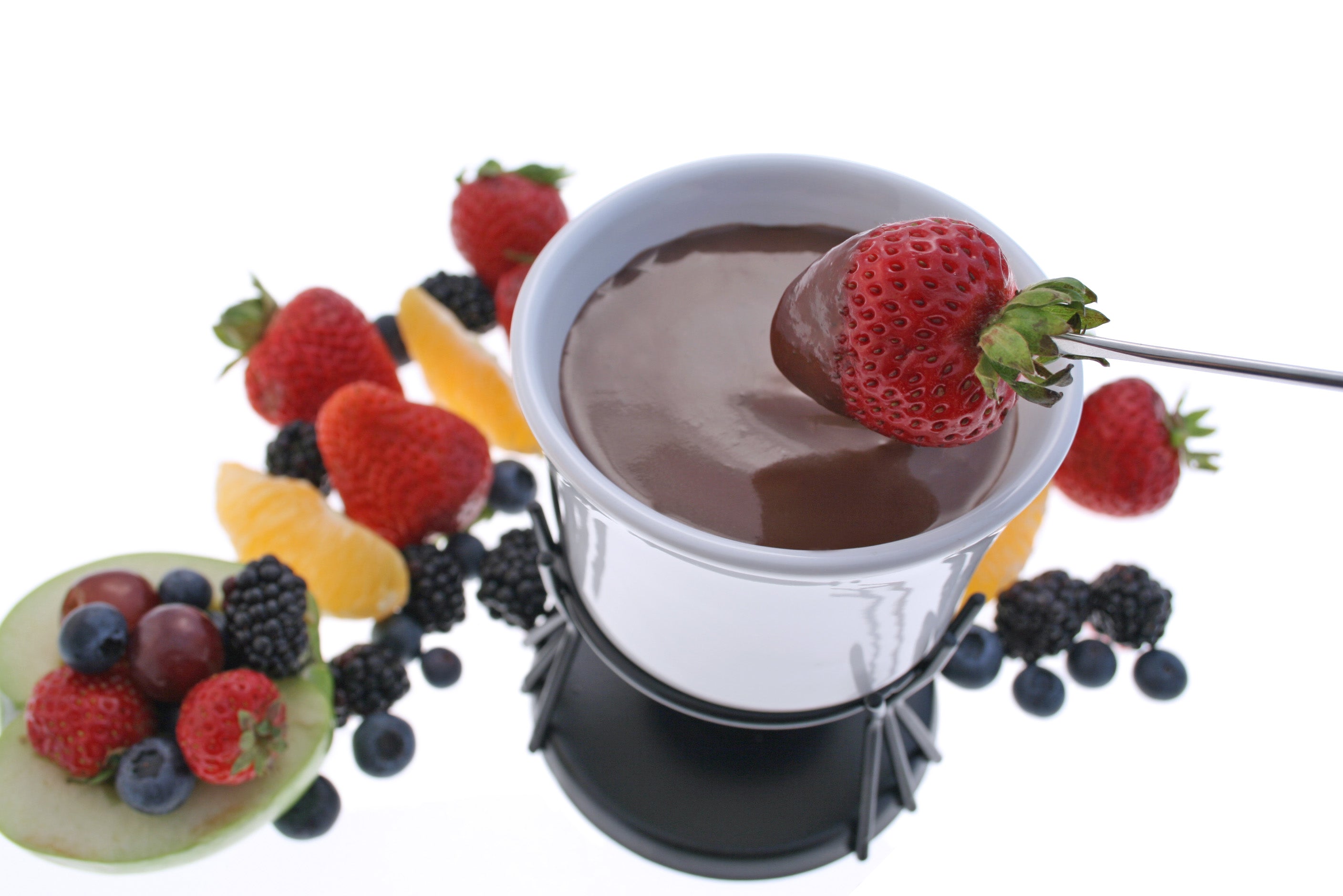 The black metal stand holds a tea light candle to gently heat the chocolate, keeping it at the perfect consistency for dipping. Four two-pronged fondue forks with plastic handles make it easy to enjoy everything from fruits to marshmallows. Packaged in a gift box, this fondue set is also a charming gift idea. Candlelight fondue can also be used for cheese.