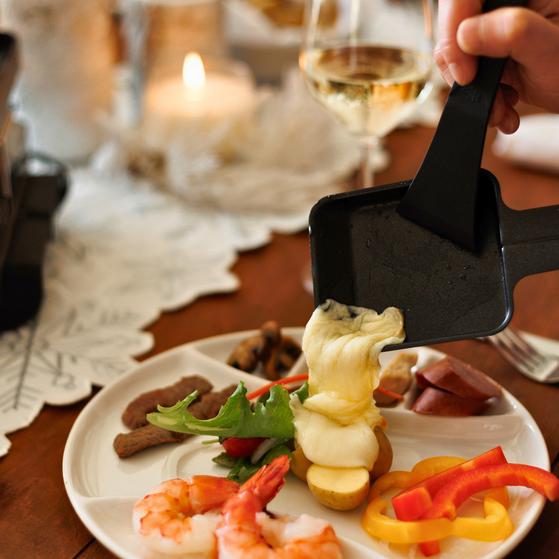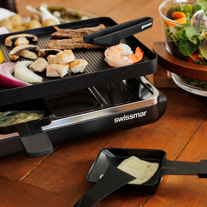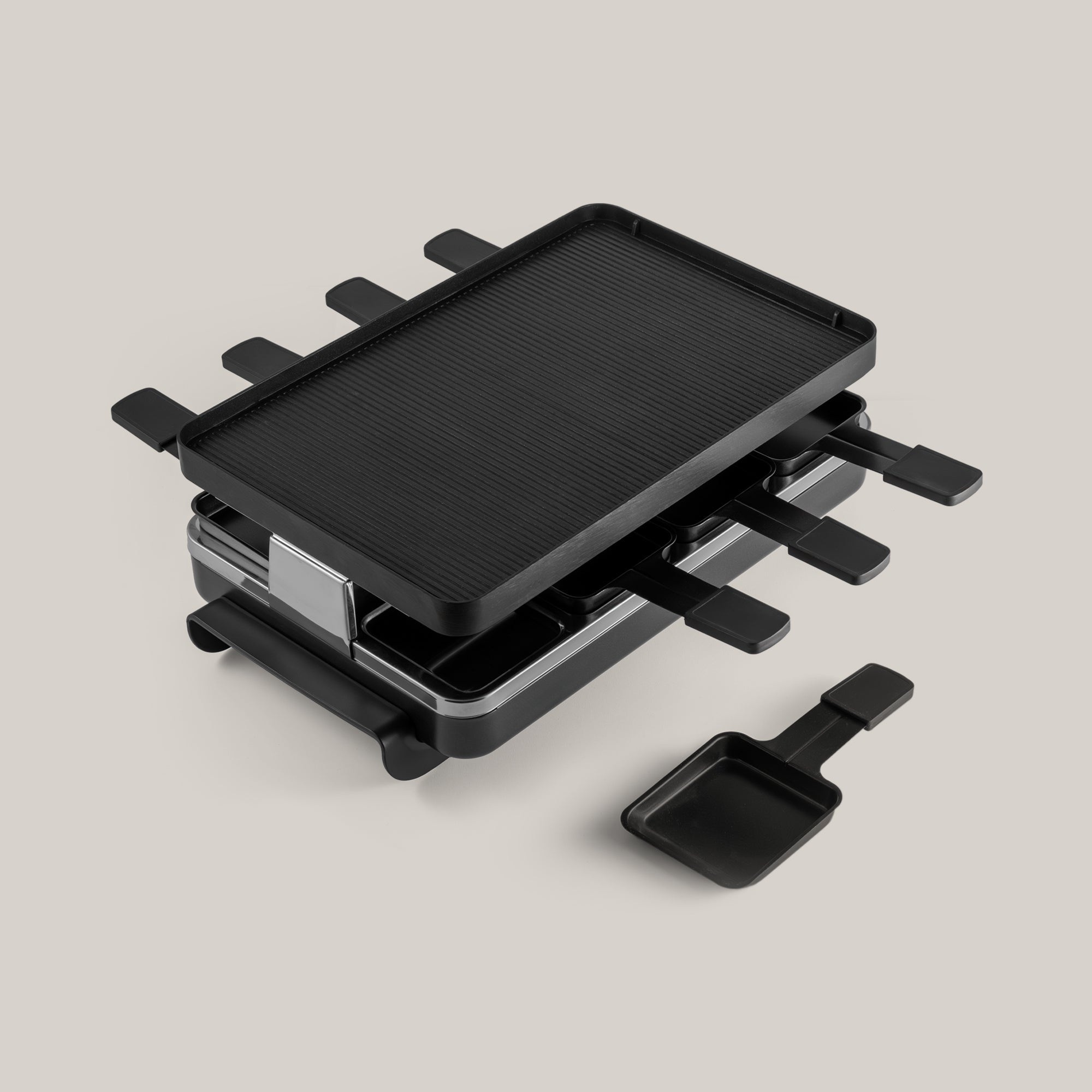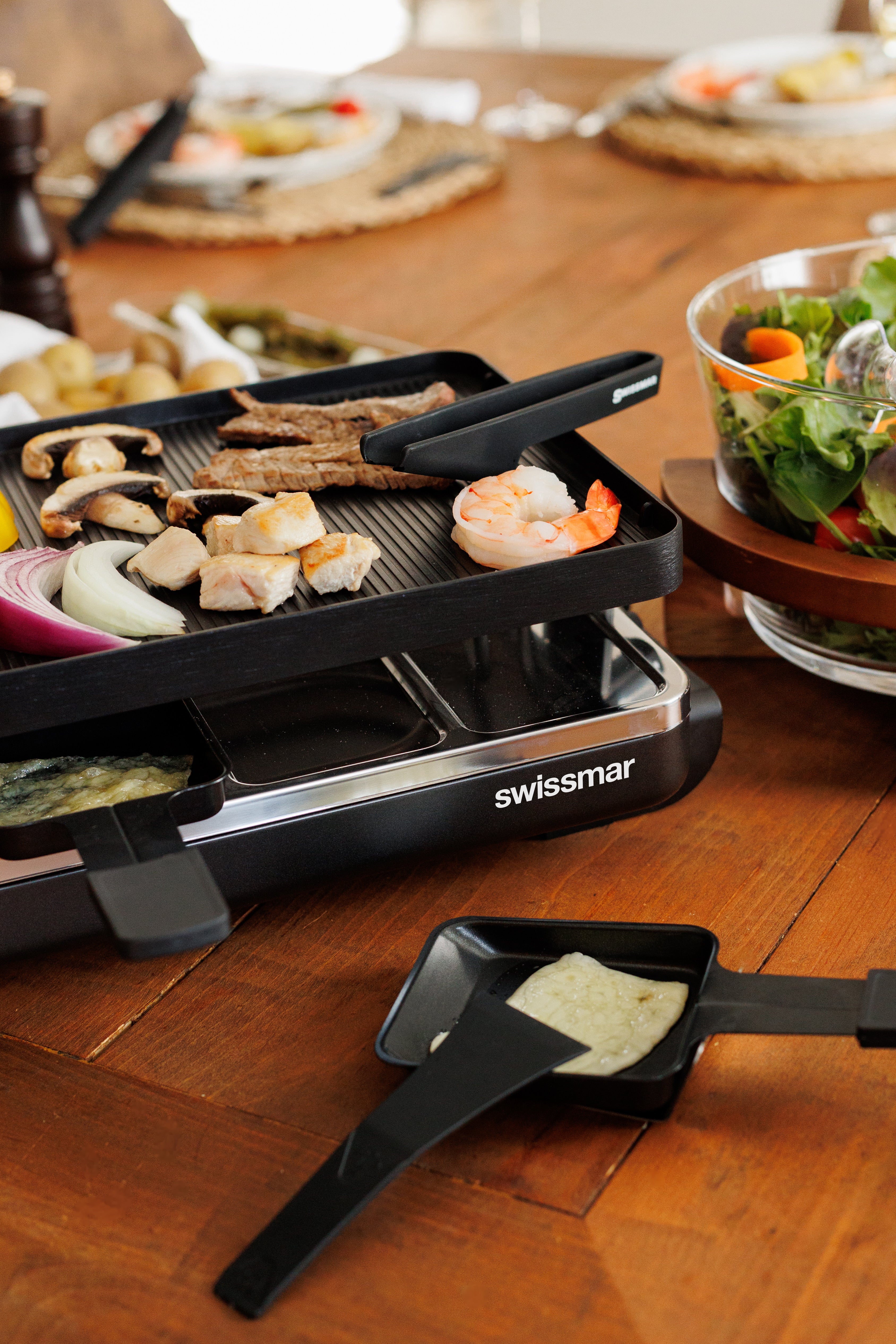 Enjoy a fun and interactive dining experience with this classic raclette grill designed for up to 8 people. The reversible cast aluminum grill plate offers versatility — use the textured side for grilling meats and vegetables or the smooth side for crepes and pancakes.